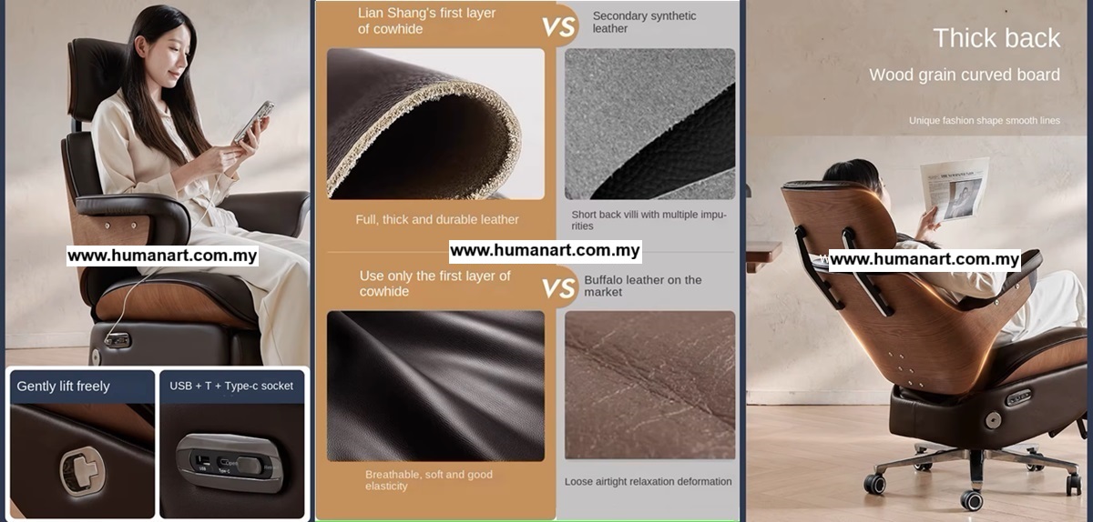 Independent Mold-Opening Handrail: The armrests are not an afterthought. They are designed with an "independent mold-opening" process, ensuring every curve and detail is perfected for ergonomic comfort and aesthetic appeal. The wooden core, combined with the genuine leather upholstery, provides a warm and tactile finish that is both elegant and supportive.